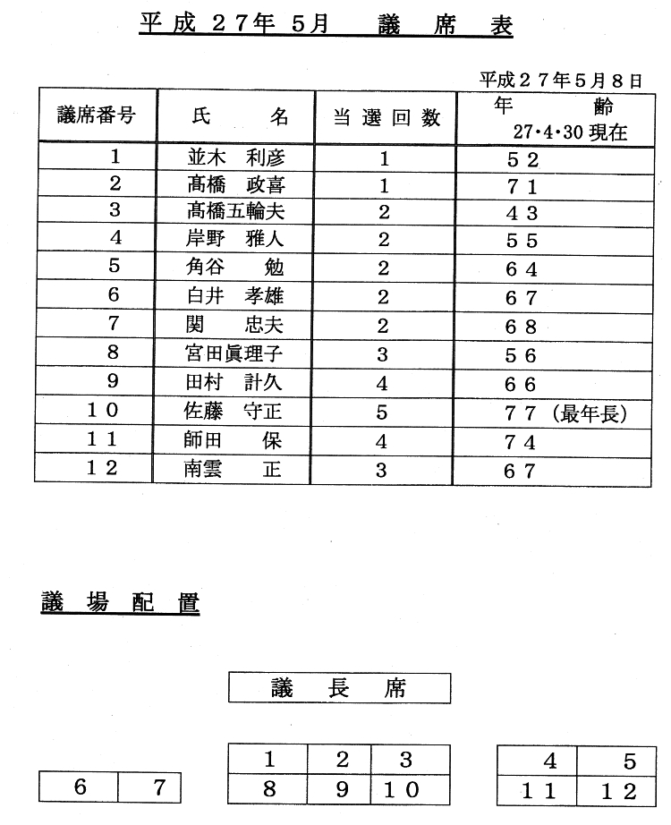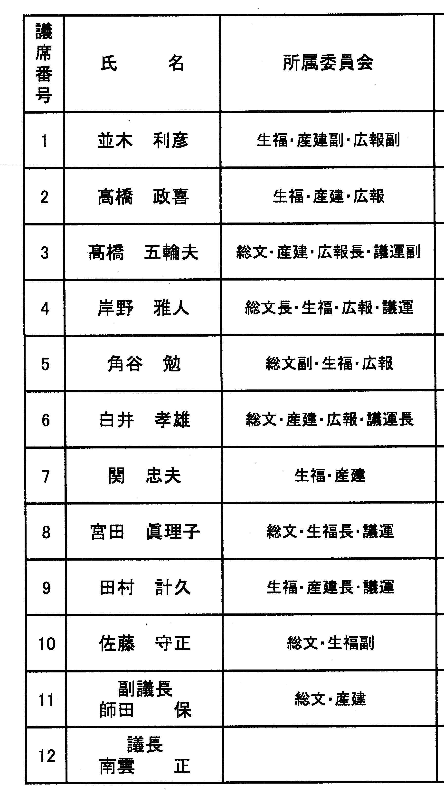 ![]() 湯沢町議会 副議長 師田 保 ![]() ![]() 総務文教常任委員会委員 定数8人 高橋 五輪夫 岸野 雅人 角谷 勉 白井 孝雄 宮田 真理子 師田 保 佐藤 守正 生活福祉常任委員会委員 定数8人 並木 利彦 高橋 政喜 岸野 雅人 角谷 勉 関 忠夫 宮田 真理子 田村 計久 佐藤 守正 産業建設常任委員会委員 定数8人 並木 利彦 高橋 政喜 高橋 五輪夫 白井 孝雄 関 忠夫 田村 計久 師田 保 ![]() 議会広報常任委員会委員 並木 利彦 高橋 政喜 高橋 五輪夫 岸野 雅人 角谷 勉 白井 孝雄 議会運営常任委員会委員 高橋 五輪夫 岸野 雅人 白井 孝雄 宮田 真理子 田村 計久 佐藤 守正 ![]() 総務文教常任委員会 委員長 岸野 雅人 副委員長 角谷 勉 生活福祉常任委員会 委員長 宮田 真理子 副委員長 佐藤 守正 産業建設常任委員会 委員長 田村 計久 副委員長 並木 利彦 議会広報常任委員会 委員長 高橋 五輪夫 副委員長 並木 利彦 議会運営常任委員会 委員長 白井 孝雄 副委員長 高橋 五輪夫 ![]() 監査委員 角谷 勉 ![]() ![]() 地方創生対策特別委員会 ![]() ![]() 今回の議案は、国の税金改定によるものや、補正予算の先決処分報告が多い臨時会議でした。 初議会でしたので、手に汗かいて緊張していました。 詳細はまた後日、書き込んでおきます。 |