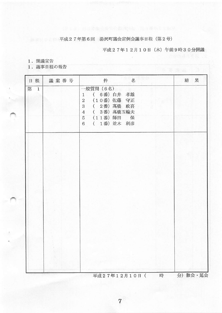 人事異動で4名~3名になり給与分減額で予算補正 人事異動で給与分を予算補正 ![]() 1.税収が少ないなりにできること。 人口減少など深刻な問題がある。人口を増やして町を活性化するか、 活性化して人口を増やすか。二つに一つである。 私は、後者の活性化して外貨を稼ぎ人口を増やす事だと思う。 行政も福祉や町の整備等に予算を付けるべき努力をしているが、税収が上昇しない限り何もできない。 もう、開き直り、徹底的に『儲ける』ということに特化した町民の意識の共有 を持つような施策が必要ではないか。 今、世界中の中でいろいろな共有の流れができており、民泊、白タクは悪い共有の流れであるが、 問題意識の共有、知識の共有、他市町村との公共施設の共有、たくさんの有意義な共有がある。 湯沢町も、意識の共有はお金が無くてもできる。 町民に毎月一回、町長、議長、商工会長、町観協会長、農業関係代表者等で各団体20分間くらいずつ、 報告会を開くことはできないか? 各団体の報告では、1ヶ月2ヶ月遅れで町民の皆様に便り等で届く。それでは、日本経済の速い流れ についていけない。 各基幹の長の話を聞き、町民が自ら何をしなければならないのか肌で感じる事が一番大切な事だと思う。 今の方向性がわかれば、むやみに全く違う事に投資しなくてすむ。 行政と各基幹の長と町民が同じ意識を持って行動すれば、今と違った展開が開けると思うがどうか? 2.外国人労働者の受入 日本ラクビーの躍進に驚き、代表選手に外国人の方も多く目に留まった。しかし、 日本のために頑張っていただいた。 この、状態が今の湯沢町に必要だと思う。今年の冬シーズン、スキー場、ホテルは人手不足で大変だと聞く。 人口減少の中、外国人労働者の受入は、避けられない問題となっているが、安易に外国人労働者を、 受け入れることはできない。いろいろな国の労働者を受け入るとすれば、言葉の表記等の問題がでてくる。 行政は、労働者の受入に直接関与することはできないが、間接的に、外国人紹介所等の会社を 紹介することと思うが、人手不足のための外国人労働者の受入の準備、対策等はどう考えているのか伺う。 3.親無きあとのハンデを持った生活支援は 近頃、湯沢町でも自ら命を絶つという悲しい出来事が続いている。 多少のハンデを持った人の生活が成り立っているのか? 不幸があった出来事に町は調べられる範囲で検証しなくてはならない。プライバシーのこともあるが、 もし問題点があれば、速やかに対応しなければならないと思うがどうか。