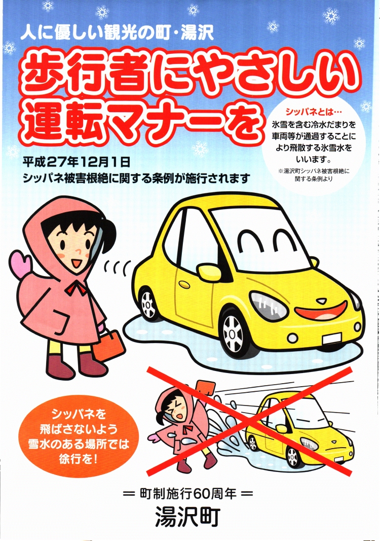 ○湯沢町シッパネ被害根絶に関する条例 平成26年12月22日 条例第29号 (目的) 第1条 この条例は、降雪地にありながらも、シッパネ被害撲滅への取り組みと 発信により「人に優しい観光の町・湯沢」の普及促進に寄与することを目的とする。 (定義) 第2条 この条例において、次の各号に掲げる用語の意義は、 当該各号に定めるところによる。 (1) シッパネ 冬期間の道路等において、道路上の氷雪を含む冷水だまりを 車輪が通過することにより、飛散する氷雪水をいう。 (2) 町民等 町民、旅行者その他町に滞在し、又は通過する者をいう。 (3) 事業者 町内で事業活動を行うすべての者をいう。 (町の役割) 第3条 町は、この条例の目的を達成するため、必要な施策を行うものとする。 2 町は、町民等及び事業者に対して、シッパネ被害の防止に関する意識の啓発に 努めるとともに、シッパネ被害が起きないように徐行等の 安全運転の周知に努めるものとする。 (町民等及び事業者の協力) 第4条 町民等及び事業者は、歩行者等に配慮した人と周辺環境に優しい運転に 努めるとともに、町が実施するシッパネ被害防止に関する施策に協力するものとする。 (委任) 第5条 この条例に定めるもののほか必要な事項は、町長が別に定める。 附 則 この条例は、平成27年12月1日から施行する。 ![]() |