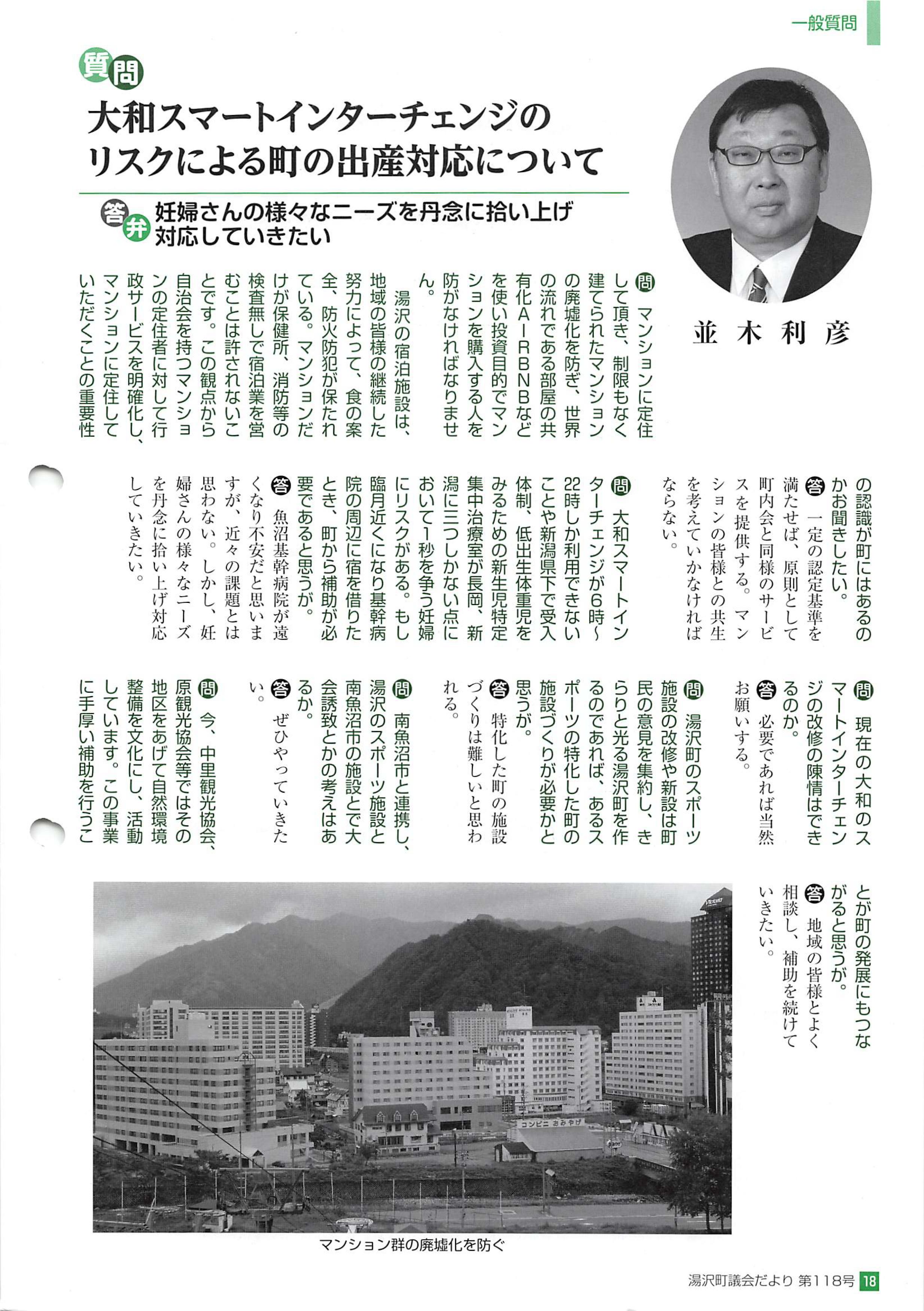 1.自治会を設立したマンションへの行政サービスについて ①今、湯沢は人口が減少する状況にあります。 人口減少は村、町等では致命的で、農業、商業、工業の すべての業種にとって 発展の妨げとなり、町民が未来に対して投資ができない悪循環となります。 人口を増やすには、住む場所、働く場所が必須となり、 先んじで住む場所の環境の整備が必要となります。 今、湯沢の中のマンションが比較的安く購入できる状況にあり、 このマンションをうまく利用して人口増加の対策に使ったらどうでしょうか。 そのマンションの中には、管理組合から自治会を 作ったマンションがあります。 湯沢に定住してマンションに住んで頂き、 定住者には、町からこのような行政サービスが受けられるということを アピールしていくことは大事なことではないでしょうか。 このマンションの自治会の位置付け、行政サービスの内容は どこまでできるのかをお教えください。 なぜ、人口増加対策としてマンションを使うのか。 二つ理由があります。 一つは、取り壊し等はマンションごとでその対応に違いはあるでしょうが、 これだけの制限もなく作られた高層マンションの乱立が廃墟化することは 避けねばなりません。 二つ目はマンションに定住者を作らないと 世界の流れである車、部屋の共有化、 なかでも部屋の共有化でもあるエアービーアンドビーなどを使い、 投資目的でマンションを購入する人がでてくるからです。 国会議員の中には、エアービーアンドビー推進者もおられます。 反対者を既得権益と指摘してしますが、 湯沢の宿泊施設は、宿泊施設や地域の皆様の 継続した努力によって、 食の案全、防火防犯が保たれています。 マンションの部屋だけが保健所、消防の検査を受けずに 宿泊商売をするのは片手落ちです。 このような観点からマンションの定住者に対して 行政サービスを明確化して マンションに住んでもらう事の重要性の 認識が町にはあるのかお聞きしたい ②これから人口減少を湯沢町がどのように対処していくか伺います 2.六日町病院の産婦人科が無くなったための緊急時の町の対応について 六日町病院の産婦人科が無くなったため、 緊急時の湯沢町の対応を伺いたい。 ある病院では、病院から遠い妊婦さんは、 臨月近くになると病院の周辺に宿を借り 対応しているそうですが、 もし臨月近くになり基幹病院の周辺に宿を借りたときに、 町から何らかの補助が必要であると思うが どのように考えているのかお教え下さい。 人口増加の目的により、出産の重要性は前よりも格段に上昇しています。 今、一番の問題は2つあります 一つは大和インターがスマートインターチェンジの 6:00~22:00しか利用できないこと もしここの時間帯以外であれば国道17号を使わなくてはいけない 二つ目は、新潟県での超未熟児の受入体制低出生体重児をみるための 新生児特定集中治療室=NICUが 長岡日赤病院と新潟市民病院と新大附属病院の3つしかない点。 出産は7ヶ月で産んでも新生児は助かります。 1秒を争う妊婦さんにこのような 高速道路のスマートインターチェンジの使用するリスクも 考えてもう一回のご答弁をお願い致します。 3.湯沢町スポーツ施設の改修、新設について ①湯沢町のスポーツ施設の改修や新設を、 町民の意見を集約して実施として頂きたい。 南魚沼市と同じようにスポーツ施設を作るのは到底無理だと思う。 湯沢町のスポーツ関係者や宿の意見を集約し、 あるスポーツの特化した町の施設つくりが必要かと思うがどうか。 きらりと光る湯沢町を作るには 特化した町づくりが必要となりますが、 ではどのような町づくりを考えておられるのかお教えください。 ②スポーツ施設の抽選方法の現状はどのようになっているのか。 スポーツ施設は、私たちの税金で作られいます。 税金を払う納税者の宿泊施設は同じ権利を持っています。 一回の抽選で100万近くは売り上げが違ってきます。 施設のある宿はまとめて抽選できます。 お客様が1組の場合、自分の施設をあけて町の施設を使えるからです。 4.スポーツ施設での南魚沼市との連携について 南魚沼市と連携し、湯沢のスポーツ施設と南魚沼市の施設とで 大会誘致とかの考えはあるのか伺う。 5.湯沢での民宿の生き残りについて ①今、中里観光協会、原観光協会等ではその地区あげての自然整備を 一生懸命行っている。湯沢町での民宿の生き残りは、 この自然を大事にすることを文化にし、活動していく事だと思う。 この自然を大切に保っている事業にこそ手厚い補助を行うことが 町の発展につながると思うが、どう考えているのか伺う ②自然を守る文化は、子供の伝統と文化を誇りに思う郷土愛を 大切にする教育につながると思うがどうか。 中里地区で今回、地域の子供にかわになを取ってきてもらい、 地域ぐるみで自然を守る活動をしています。 このような地域と学校で自然環境を守る尊さを教えることこそが IターンUターンにも