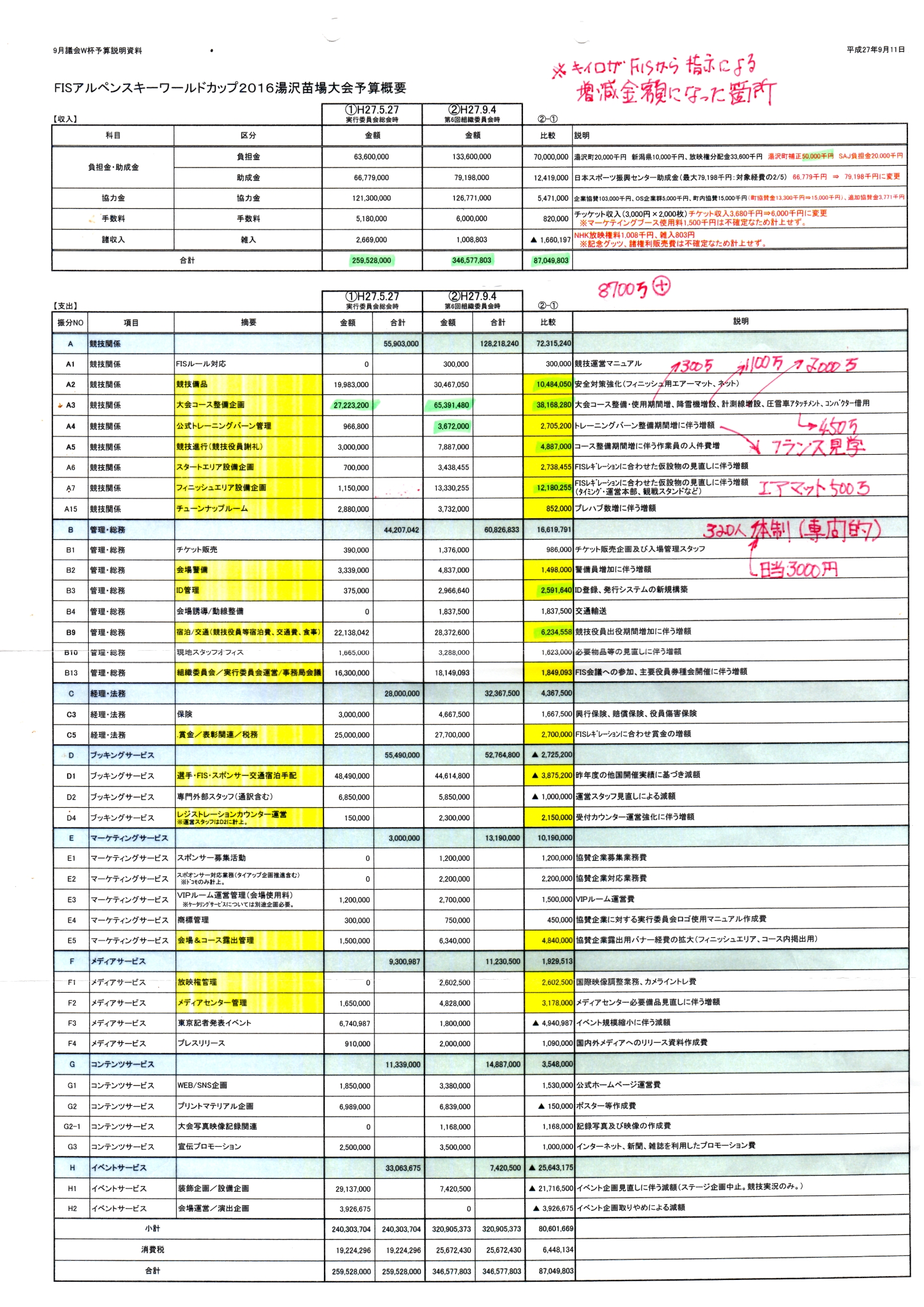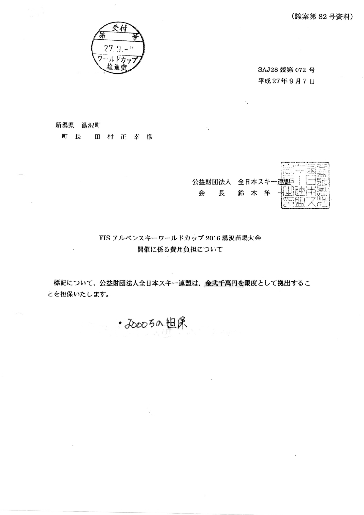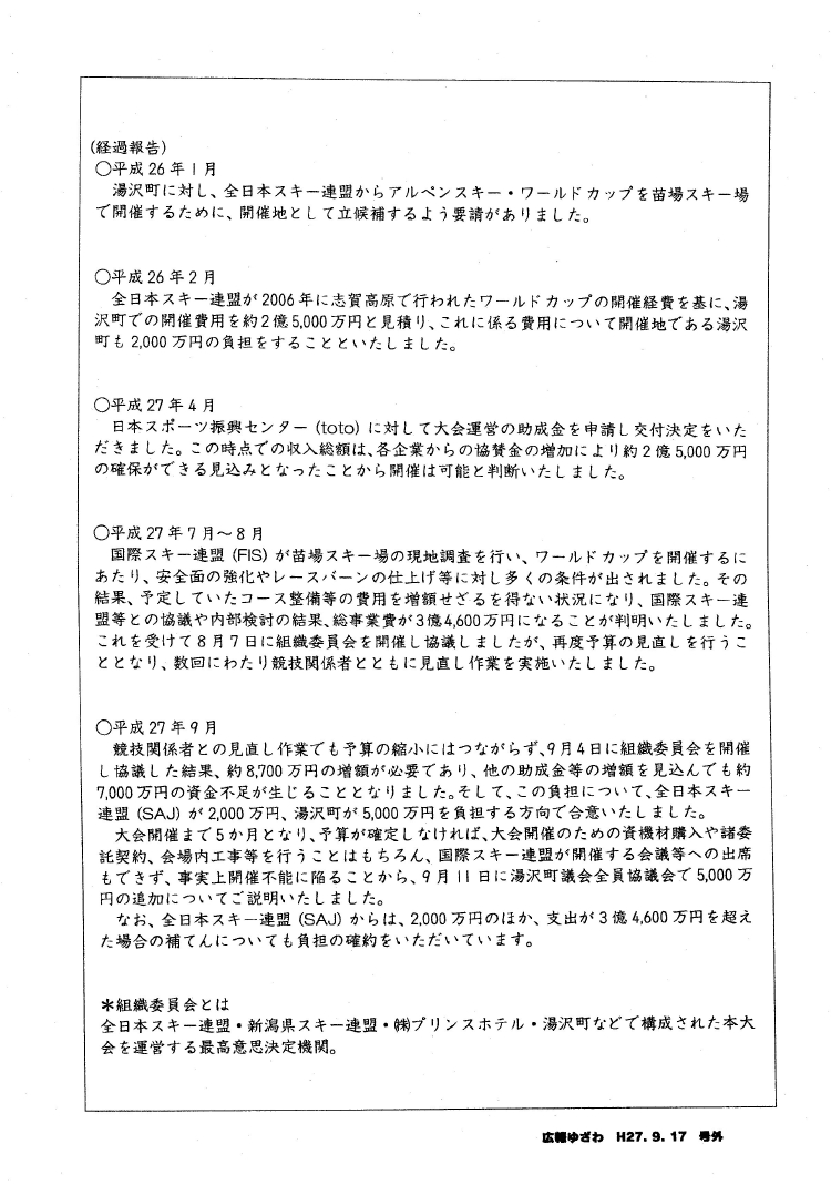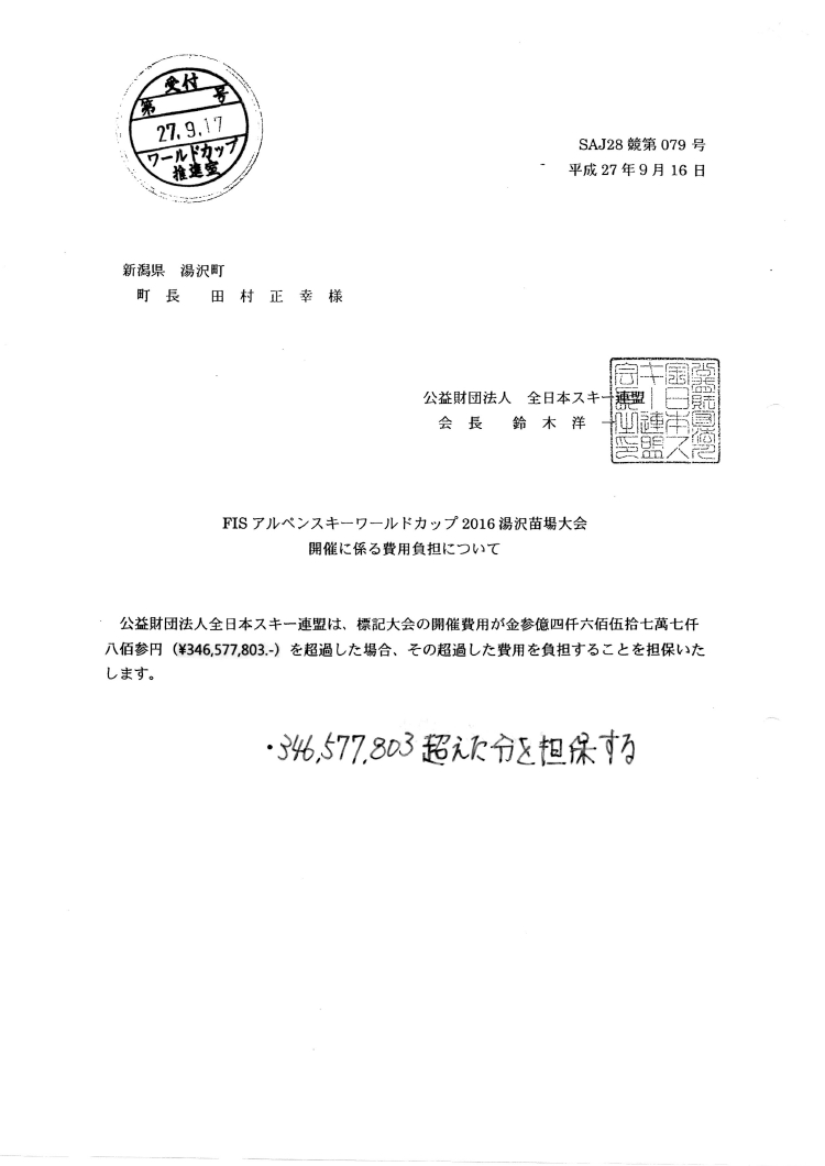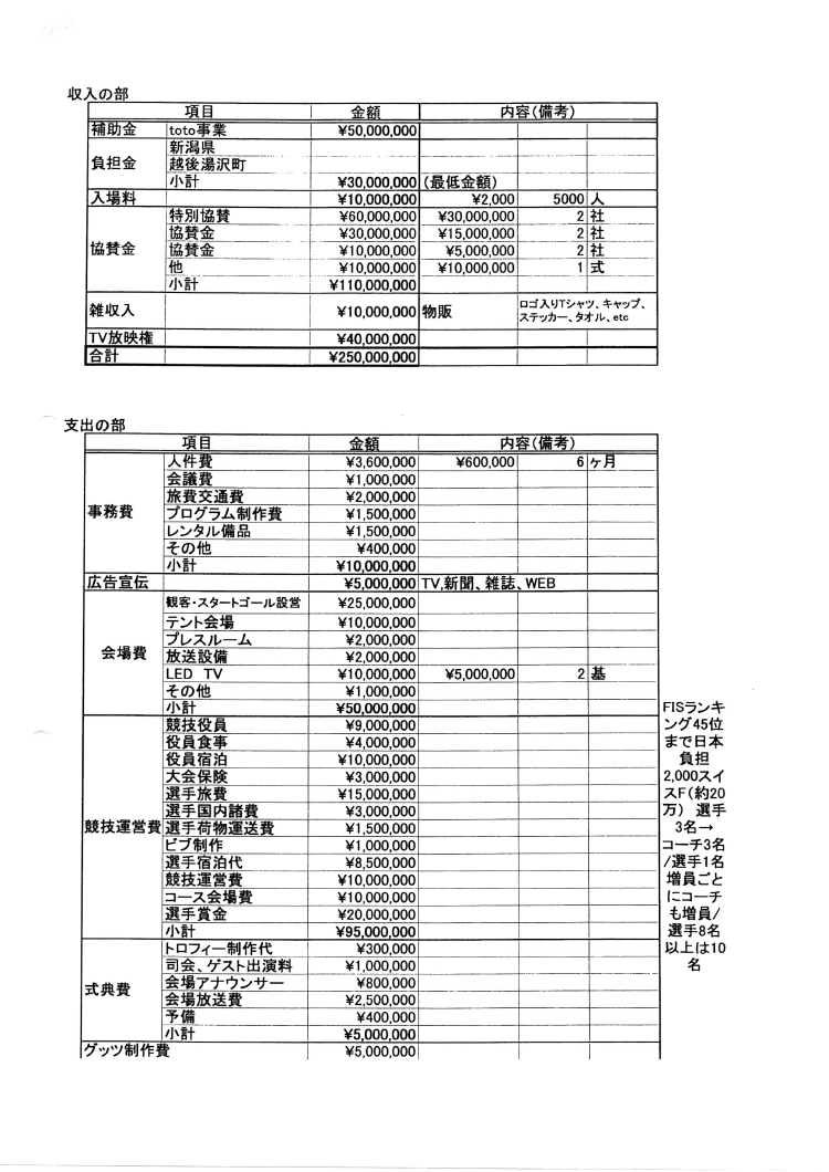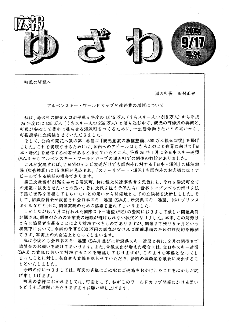 ■町長より ワールドカップ大会開催に付き5000万の補正予算の増額をしたいとの説明。(広報ゆざわ 参照) 【要 点】 ・当初は、平成26年2月で2億5千万の大会予算で町負担は2000万であった。 ・今回、平成27年7月にFISが現地調査を行い、大会費が3億4千600万となった。 ・平成27年9月で組織委員会で協議した結果8700万円不足と増額が必要となり他の 助成金を見込んでも7000万足りなくなった。 ・そのため湯沢町が5000万。全日本スキー連盟が2000万を負担することで合意した。 ・全日本スキー連盟は、2000万を担保した。 ・全日本スキー連盟は、346,577,803円を超過した場合、超過費用を負担することを担保した。 ・契約後も大会当日まで行政は、協賛等、協力をお願いし湯沢の負担分を減額できるよう動いて行く。 ■議事録は、あとで添付します。 ■【結 果】 賛成7 反対4で 可決 ■私は賛成しました。 【理 由】 今、湯沢町の冬は、以前と違い低迷しています。 ここで、何かをしなければ、スキーの町、湯沢は薄れていき 冬の観光が、成り立たなくなると思います。 冬の観光が、成り立っている現状だからこそ、出稼ぎなど雪の無い所 に行って仕事をしなくてもいいのです。 ワールドカップは絶好の宣伝イベントです。 世界の湯沢。日本の中の湯沢をアピールできる数少ない機会です。 今回、その機会を得てワールドカップ誘致に名乗りを上げ、 ここまで準備を進めてきました。ここまで、きたいじょう 開催をやめることより、やることの方が湯沢にとっての 将来的な観光に対して有利だと私は思います。 ここでやめれば、負の連鎖反応が続き、 湯沢の発展にマイナスとなると思い ワールドカップ予算措置はやむを得ないと私は思い賛成しました。 しかし5000万円は、大金であり、税金でもあり、福祉で使えば、 相当なことができます。この金を無駄にしてもらっては こまります。 ワールドカップを成功させ、冬の湯沢町に経年的に外貨を引き込めるよう していかなければならないと思います。 給与条例の一部を改正する条例の制定について ■町長より、今回のワールドカップ大会開催が予算不足となった責任をとり 半年の月給半額にしたいとの説明。 ■【結 果】 賛成少数で 否決 ■私は賛成しました。 【理 由】 5000万は大金であり、税金でもあるので、一旦、けじめをつけ これからの任期を、頑張って頂きたい。期待しています。 ![]()