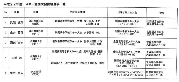 スキー全国大会出場選手一覧