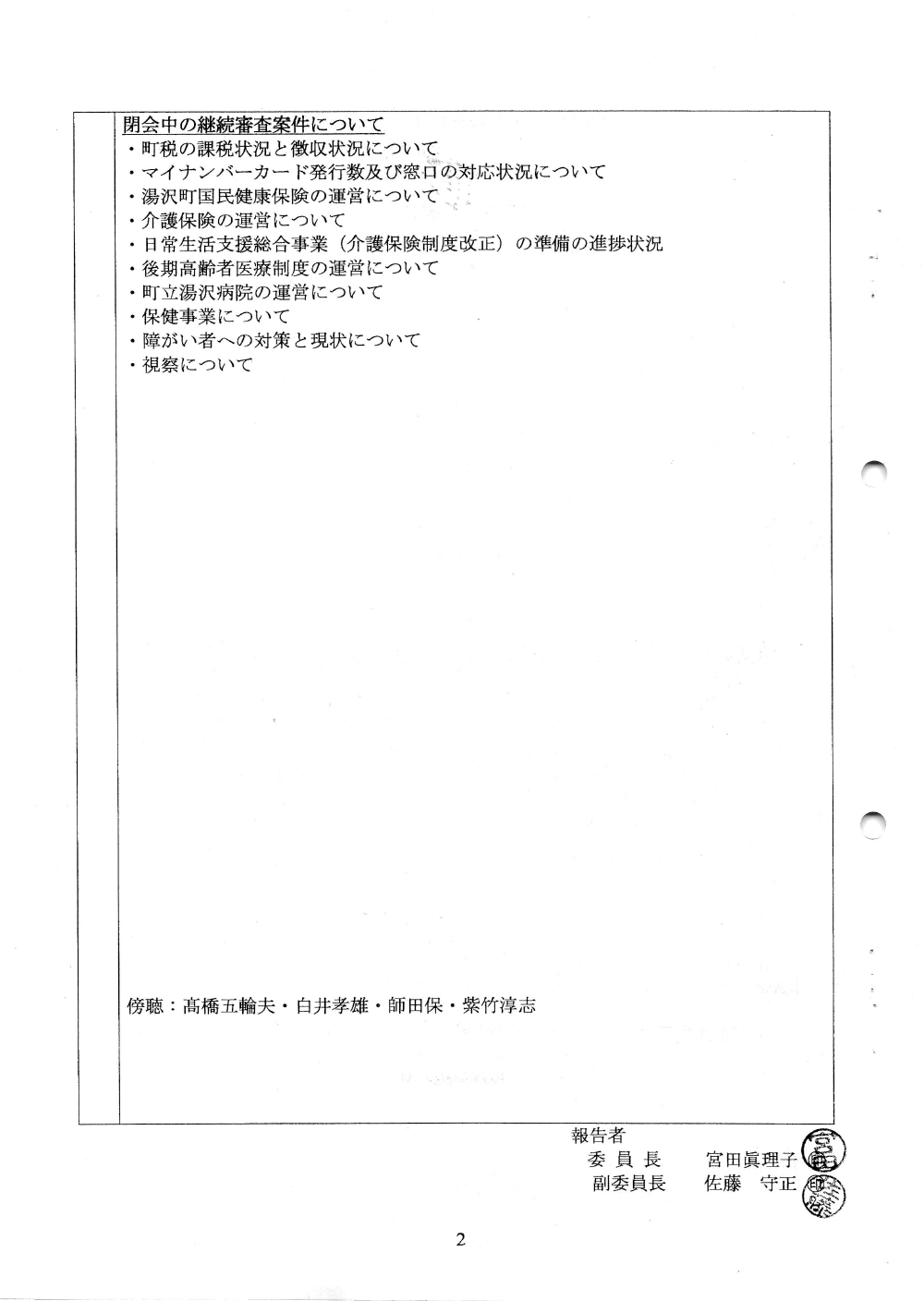 ・ 佐藤守正 議員 ・ 白井孝雄 議員 ・ 高橋政喜 議員 ・ 並木利彦 議員 ・ 宮田眞理子 議員 ・ 岸野雅人 議員