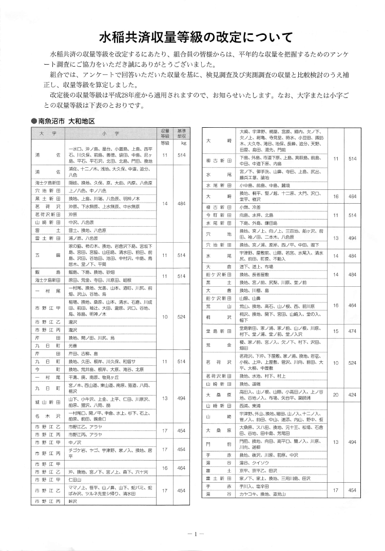 水稲共済収量等級の改定