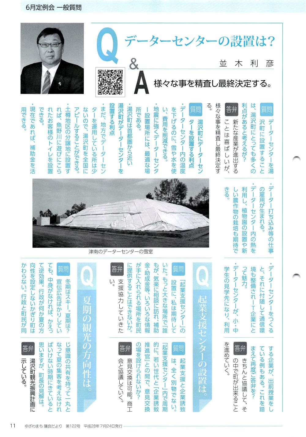 以上のように私は考えますが、湯沢町にデーターセンターの設置に対して、町長のどのように考えておられるかうかがいます。