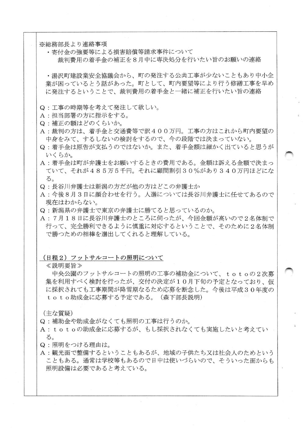 2020年は、オリンピック年でもあり、湯沢町で諸問題が発生しますのでそれらの調整等を十分考慮して動いて頂きたい。 8月中旬にSAJ理事会がありいろいろな事が決定しだい議会と協議したいとのこと。 助成金なしで、町単独の2800万円をかけての照明設置は認めたくない。議会が認めないのに照明設計発注はありえない。 万が一議会で、否決されれば設計費は無駄金となる。