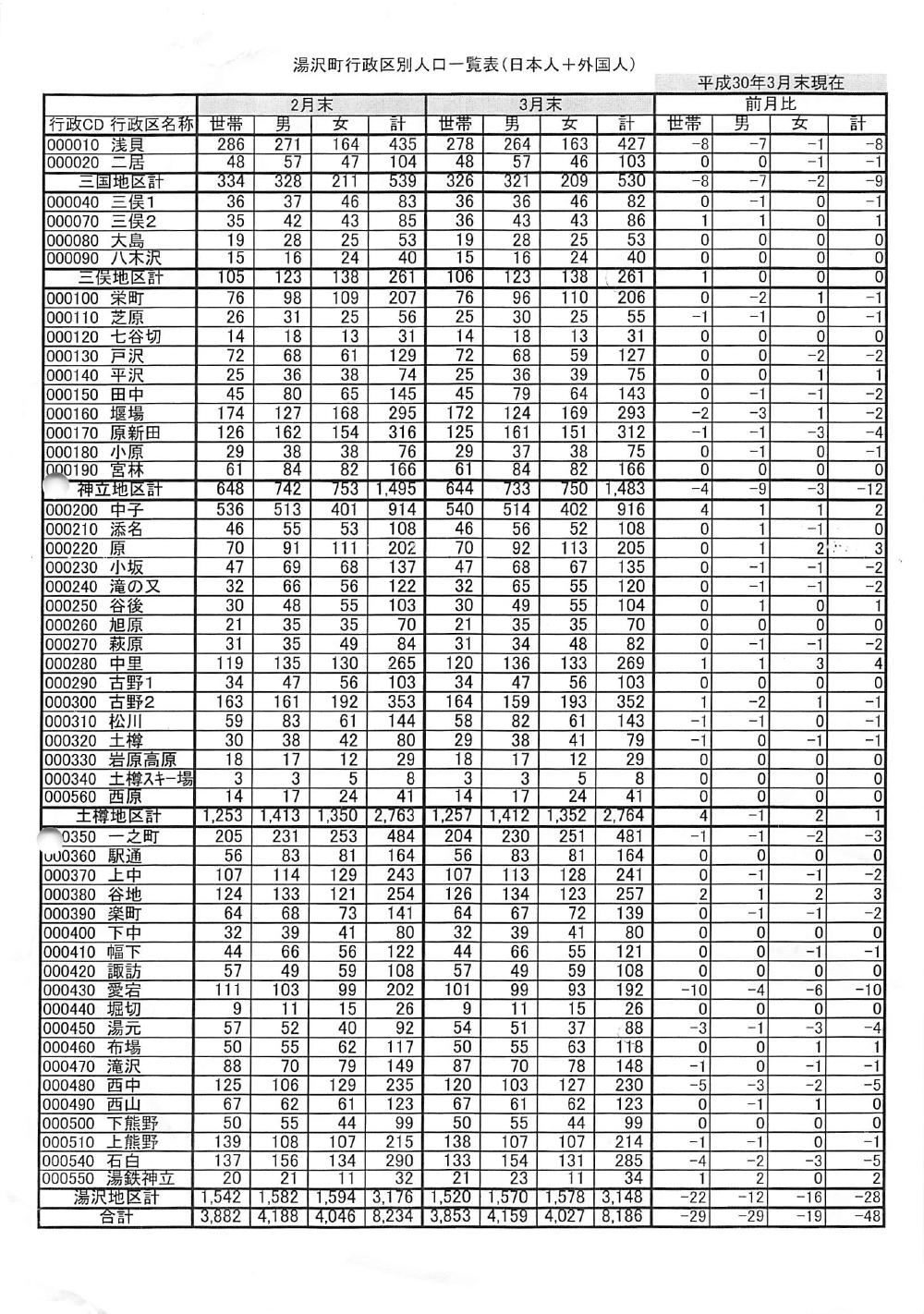 湯沢町行政区別人口一覧表