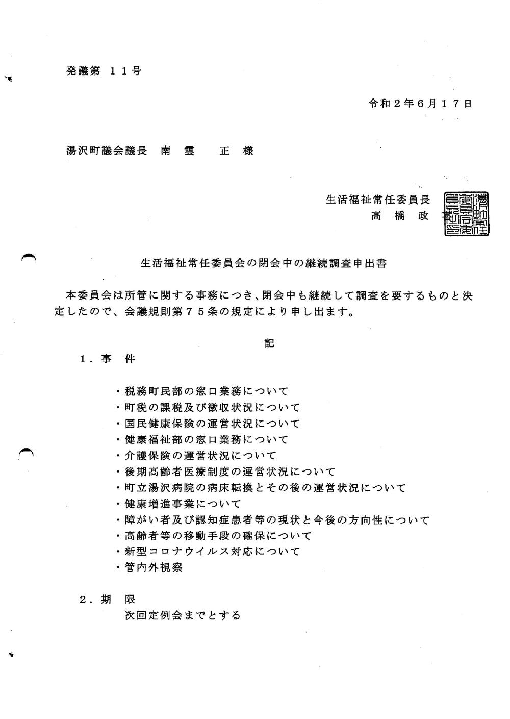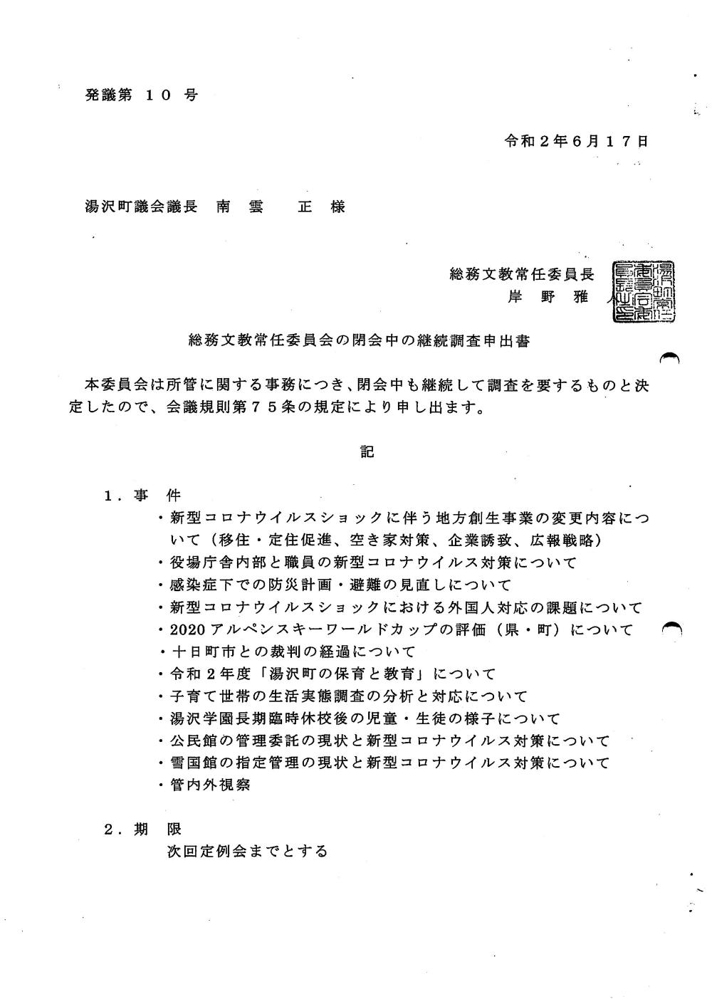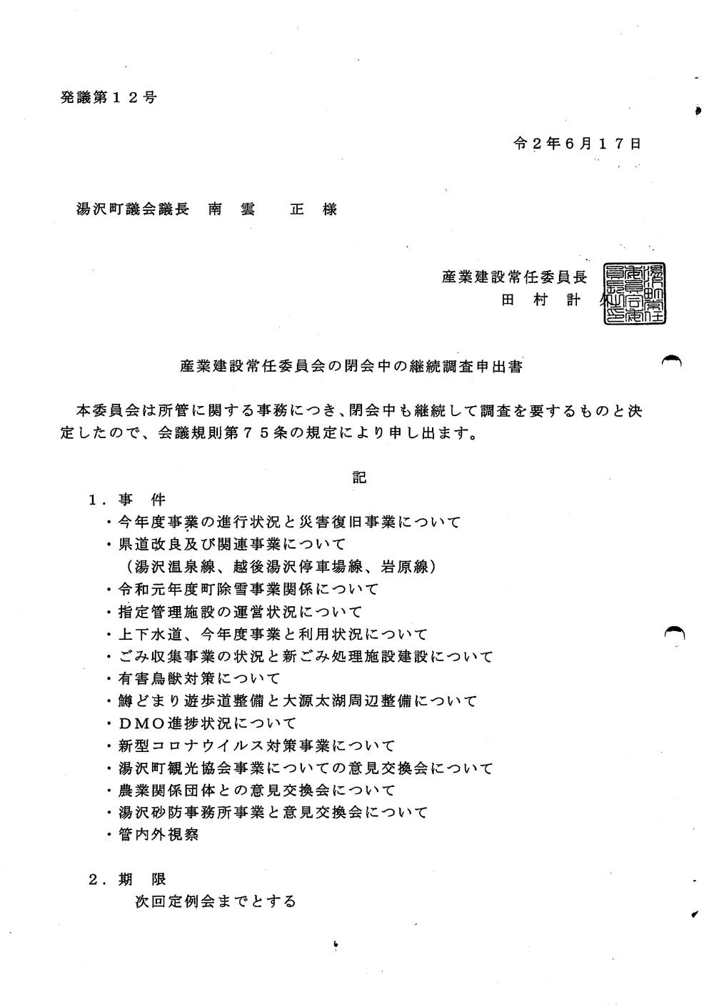 湯沢町議会  2019年6月定例会  各委員会閉会中の継続調査
