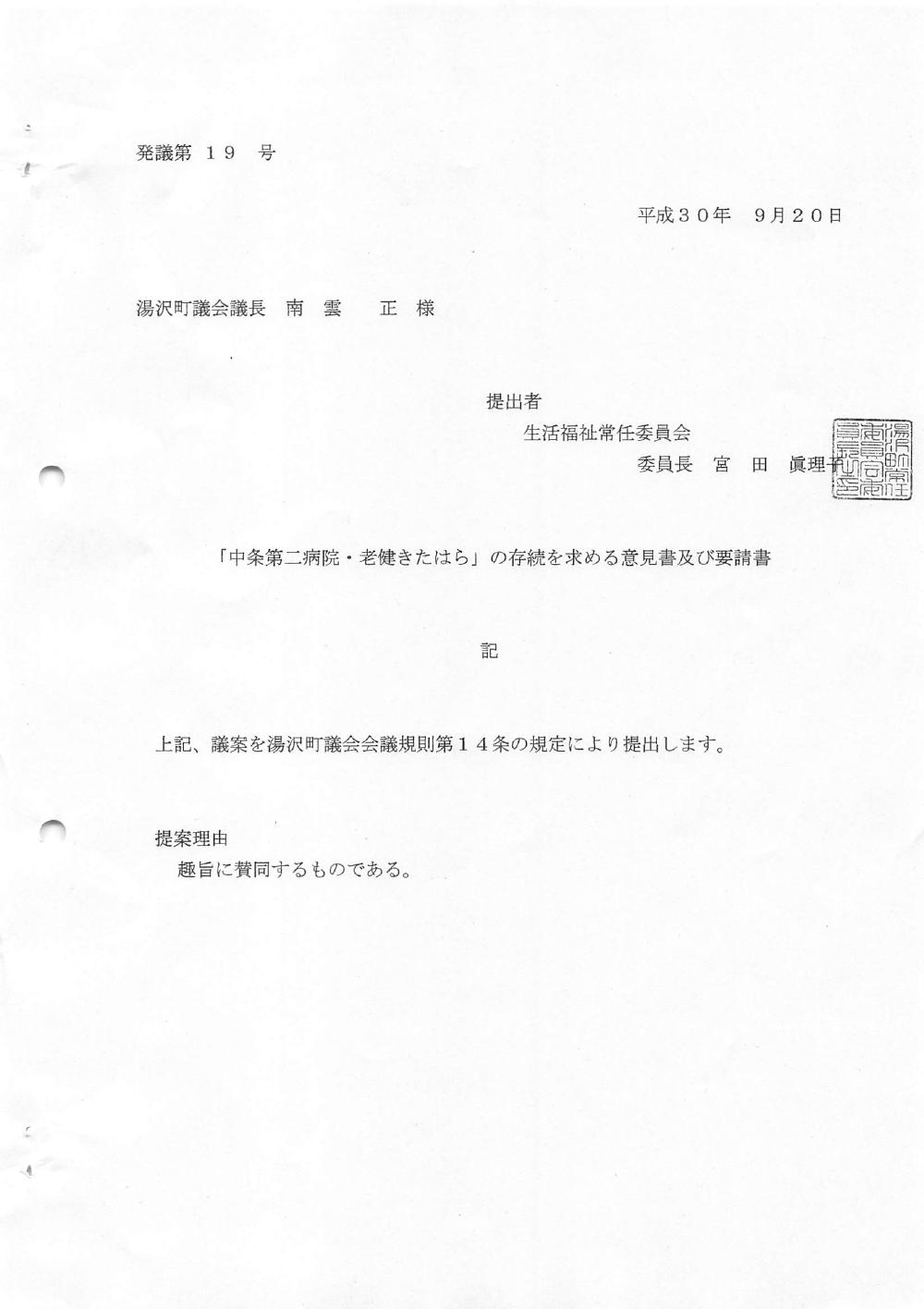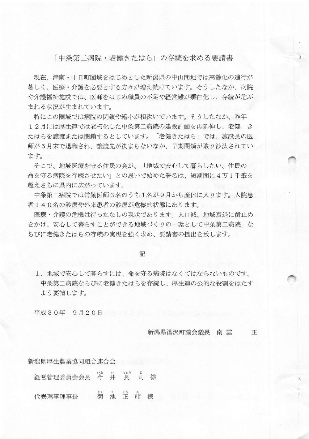 「中条第二病院・老健きたはら」の存続を求める意見書及び要請書」
